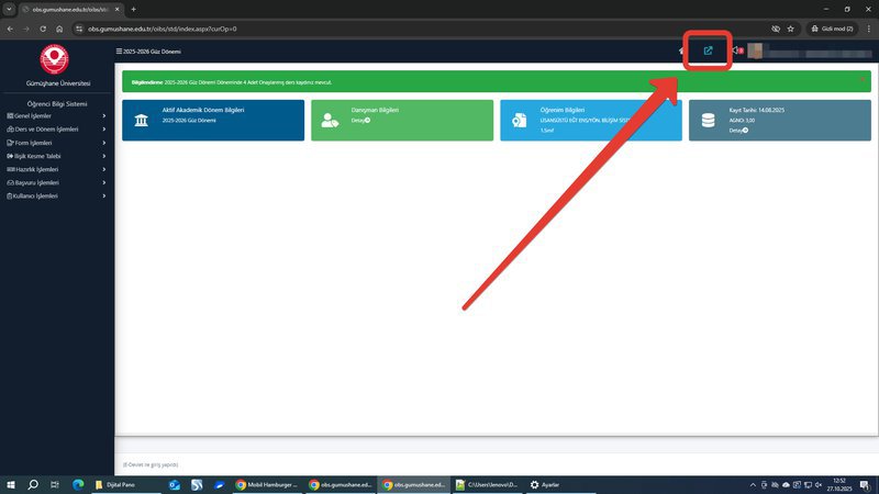 Ders bilgi sistemine girişler artık http://obs.gumushane.edu.tr adresinden gireceğiniz öğrenci ve akademisyen otomasyonunda yer alan aşağıdaki ekran görüntüsünde belirtilen bağlantı ile yapılacaktır. Eski giriş yöntemi olan kullanıcı adı ve şifre ile girişler kaldırılmıştır.